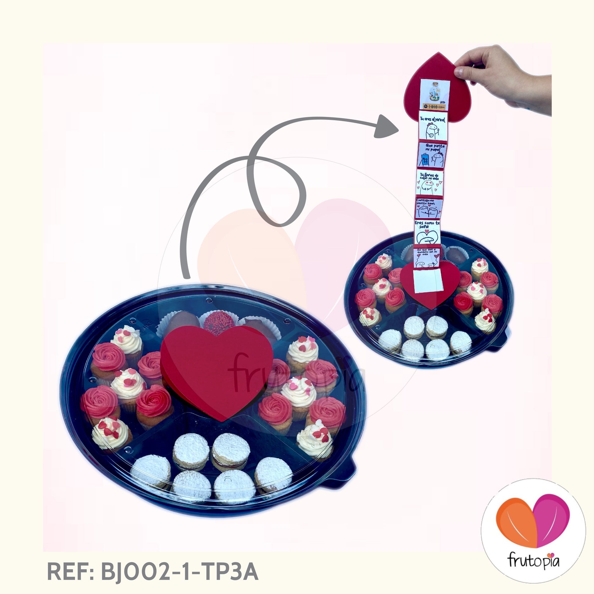 5 fresas con chocolate, 6 alfajores, 14 minicupcakes y en el centro 1 cupcake + TARJETA ACORDEÓN.
