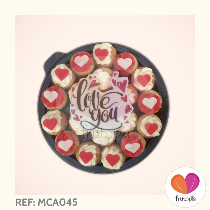 Bandeja x 20 minicupcakes decorados con crema de mantequilla sabor a vainilla y mensaje en impresión comestible "love you"