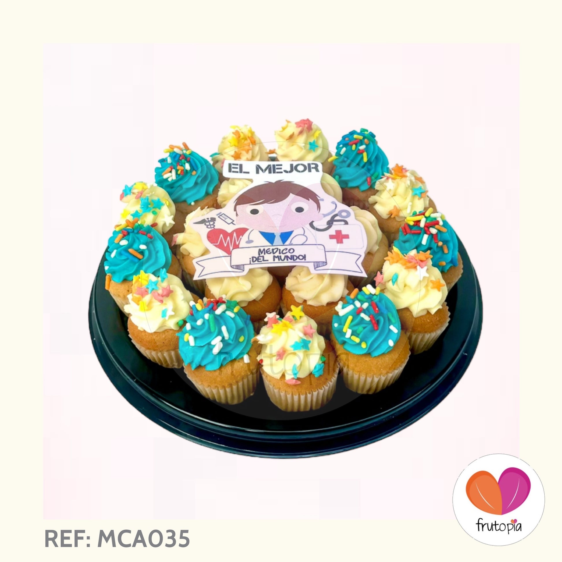 Bandeja x 20 minicupcakes decorados con crema de mantequilla sabor a vainilla y mensaje en impresión comestible "el mejor médico del mundo"