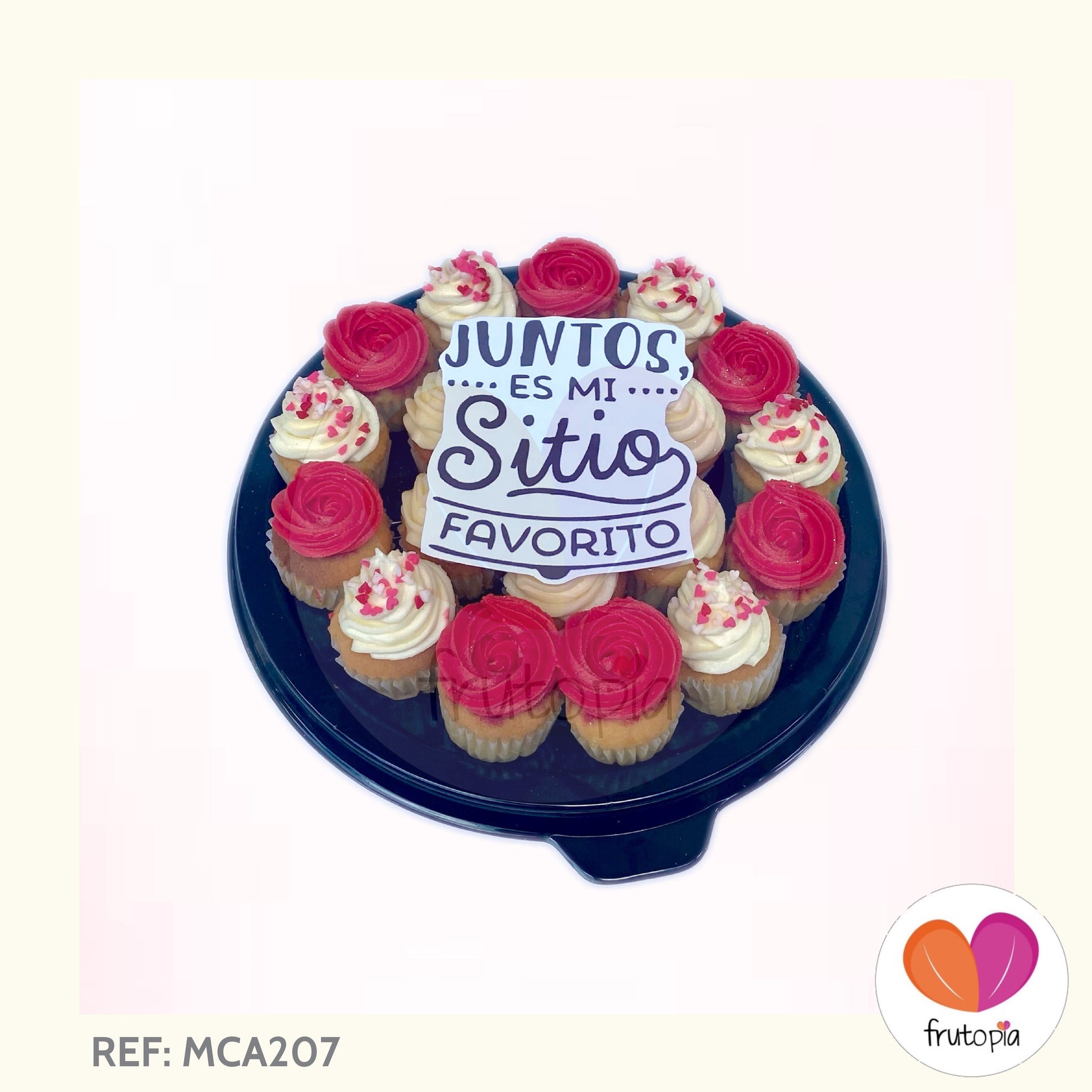Bandeja x 20 minicupcakes decorados con crema de mantequilla sabor a vainilla y mensaje en impresión comestible con el mensaje " Juntos es mi sitio favorito".