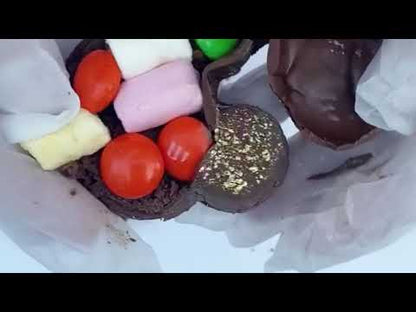 En la mitad oso de chocolate relleno de m&m, gomitas y minimasmelos.