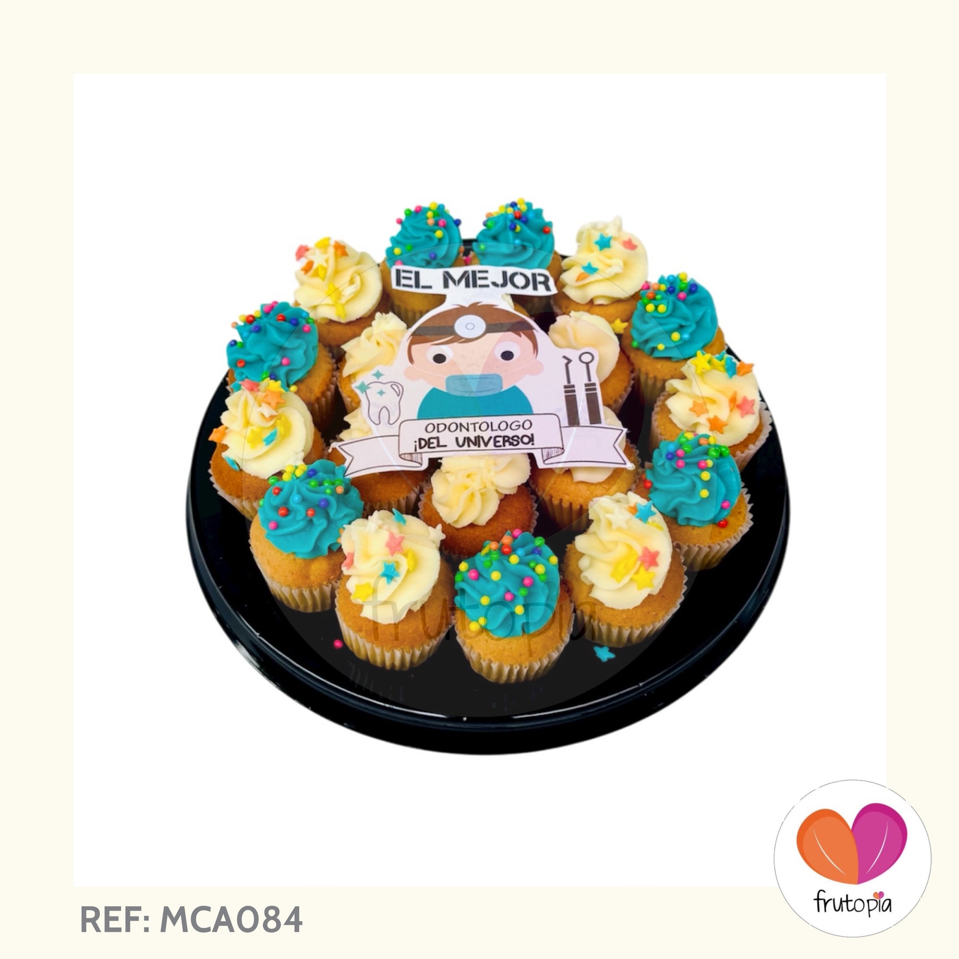 Bandeja x 20 minicupcakes decorados con crema de mantequilla sabor a vainilla y mensaje en impresión comestible "el mejor odontólogo del universo"