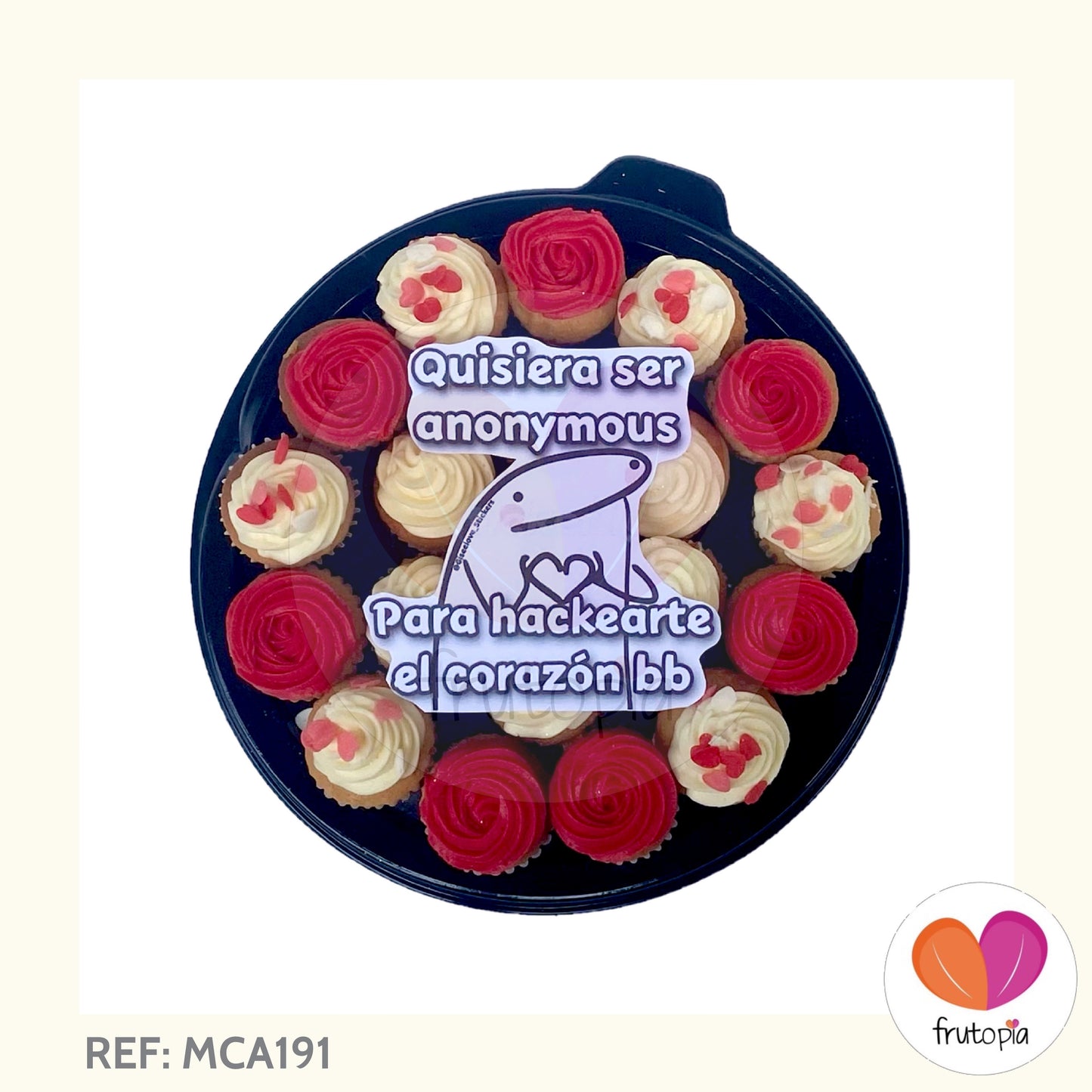 Bandeja x 20 minicupcakes decorados con crema de mantequilla sabor a vainilla y mensaje en impresión comestible "QUISIERA SER ANONYMOUS PARA HACKEARTE EL CORAZÓN BB"