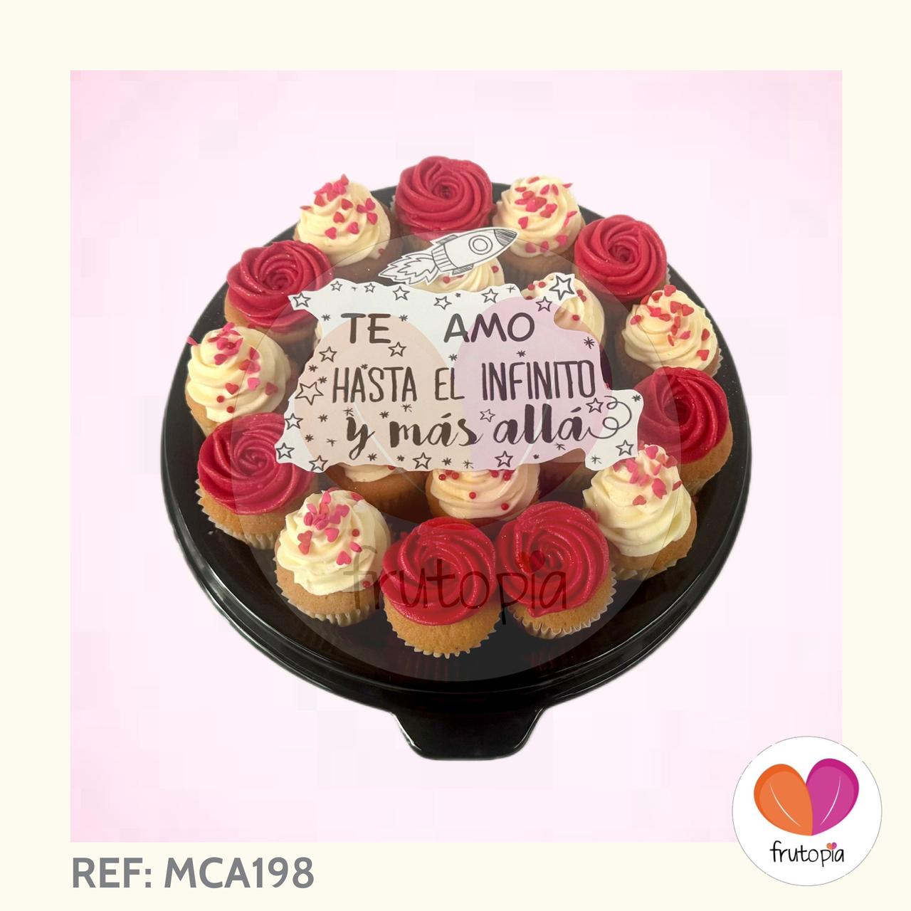Bandeja x 20 minicupcakes decorados con crema de mantequilla sabor a vainilla y mensaje en impresión comestible "TE AMO HASTA EL INFINITO Y MAS ALLÁ"