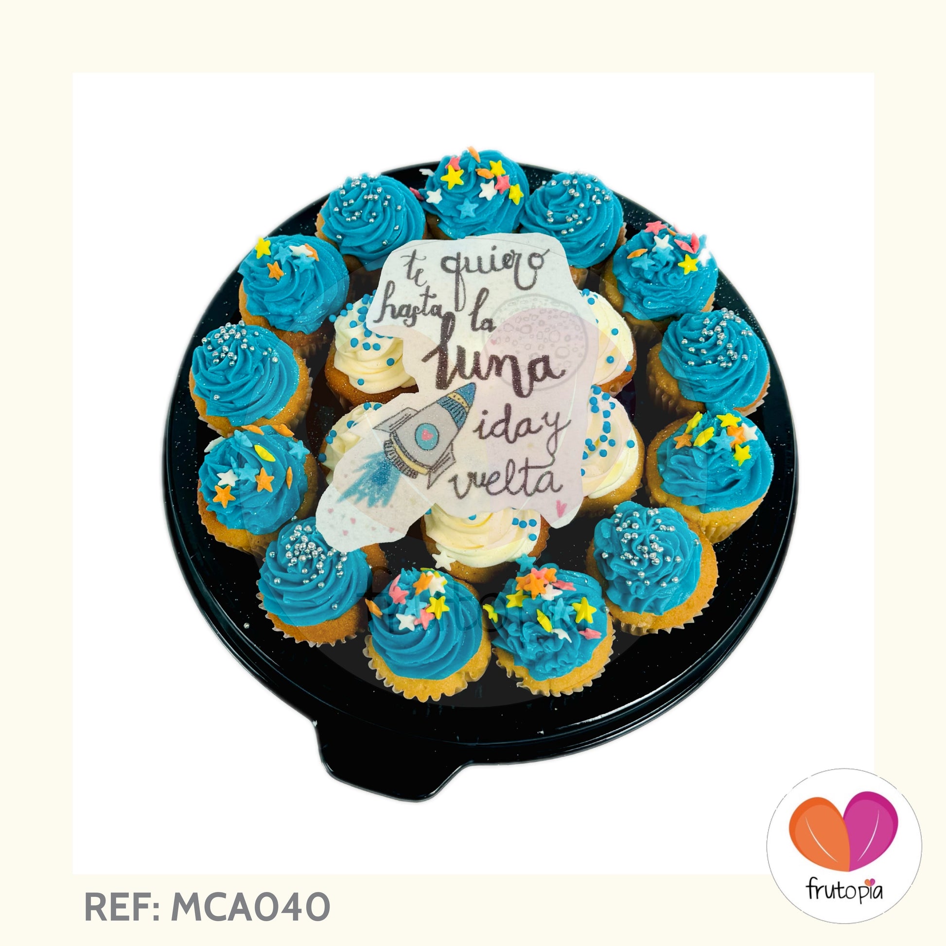 Bandeja x 20 minicupcakes decorados con crema de mantequilla sabor a vainilla y mensaje en impresión comestible "te quiero hasta la luna ida y vuelta"