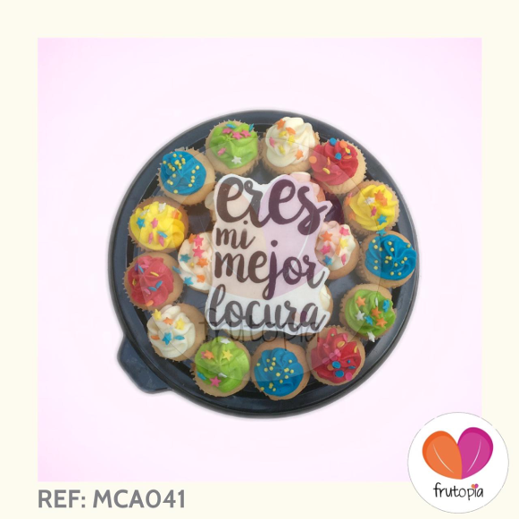 Bandeja x 20 minicupcakes decorados con crema de mantequilla sabor a vainilla y mensaje en impresión comestible "eres mi mejor locura"