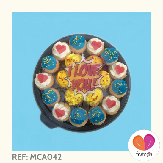 Bandeja x 20 minicupcakes decorados con crema de mantequilla sabor a vainilla y mensaje en impresión comestible "i love you"