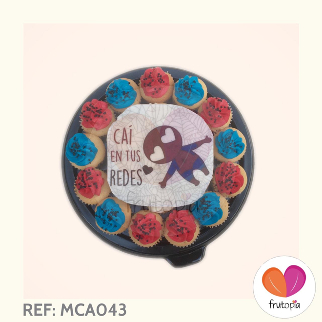 Bandeja x 20 minicupcakes decorados con crema de mantequilla sabor a vainilla y mensaje en impresión comestible "caí en tus redes"