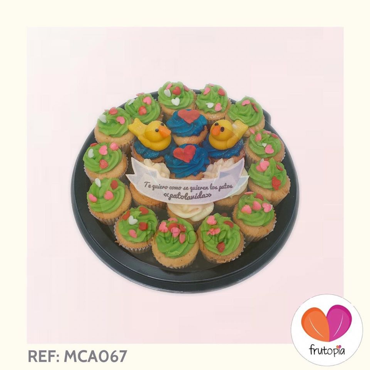 Bandeja x 20 minicupcakes decorados con crema de mantequilla sabor a vainilla, mensaje en impresión comestible "te amo como se aman los patos patolavida" y figuras en mazapán.